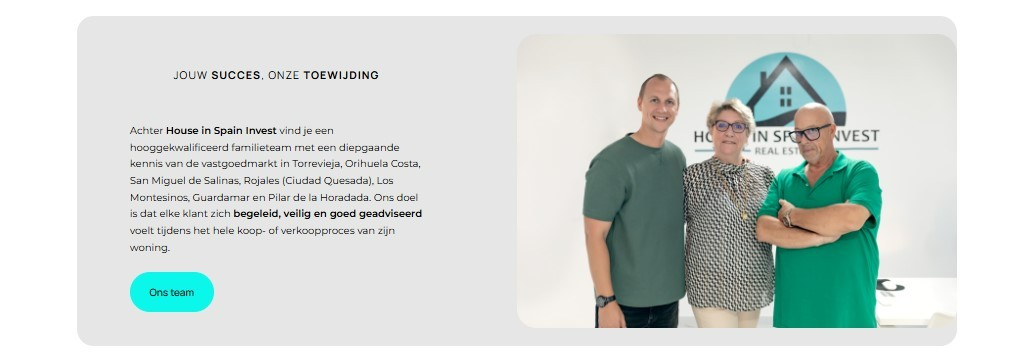 HOUSE IN SPAIN INVEST es una agencia inmobiliaria familiar belga, especializada en propiedades en España. Con más de 20 años de experiencia, ayudan a clientes nacionales e internacionales a comprar y vender viviendas en Torrevieja, Orihuela Costa y alrededores.
